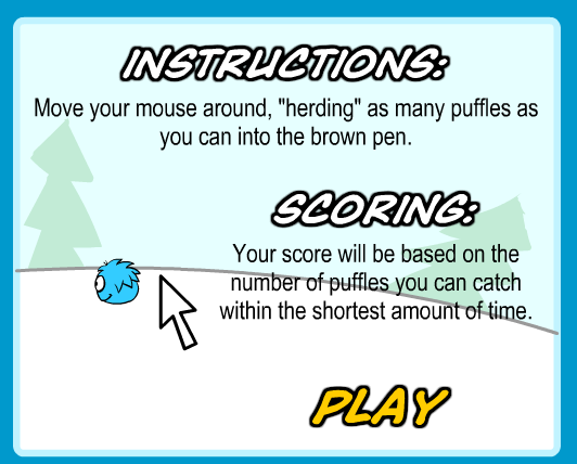 The game is very easy, you just use your mouse/cursor and move it around the small fieldish area and herd the puffles basically. If one of them accidentally escapes (curse you puffles!!) :P That's alright it won't end the game, just be careful to not make them get around the edges. Each type of puffle actually has a certain speed like