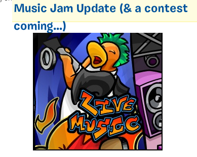 Hey ppls :] As you can all tell the Music Jam is just 3 days away! I hope all you bands out there have been practicing, and maybe used my guide :) Anyways as you can see this is a small pic of what the Music Jam will look like! I hope the party is awesome just like last years! ;] and at the annual Music Jam there will be a backstage room for members only! (sorry to all the non-members ;o) and only in that one room, there will be RANDOM appearances by Penguin Band and Cadence ^_^ so good luck finding them! Good thing I met pb randomly at the awards :p (PB means Penguin band) ^_^Anyways Cp will also be doing the annual Penguin Tales writing contest! On July23- August 5th they will be looking for entries!